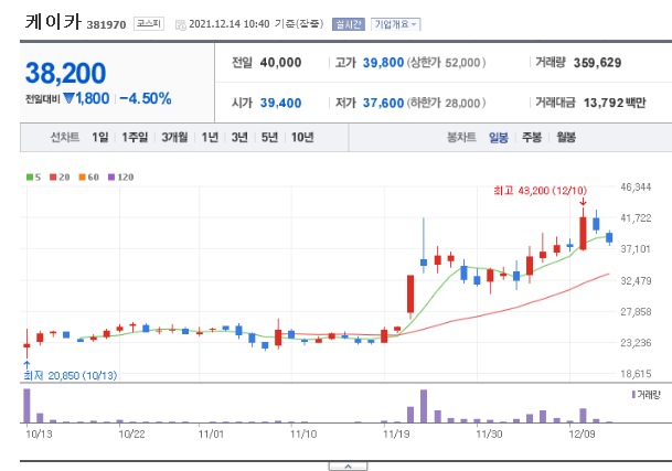 21년 12월 14일 오전 현재 주가는 38,200원으로 전날 대비 1,800원 하락하였습니다.