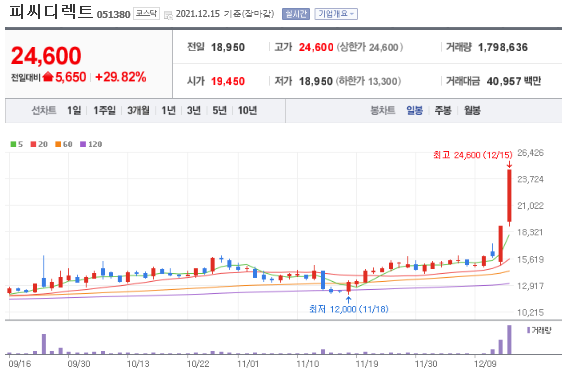 12월 15일 피씨디렉트 주가가 상한가를 기록하였습니다. 주요 이슈와 피씨디렉트 주가 전망에 대해 알아보도록하겠습니다.