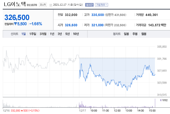 12월 17일 자 주가는 326,500원이며 52주 최고가는 336,000원이며, 최저가는 161,500원입니다.