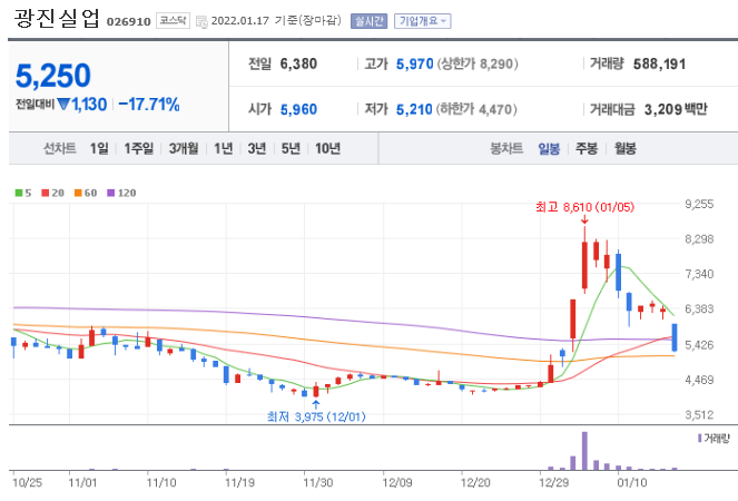 광진산업은 최근 안철수 관련주로 주목 받으며 급등하였습니다. 당일은 조정 받으며 하락하였는데요.
