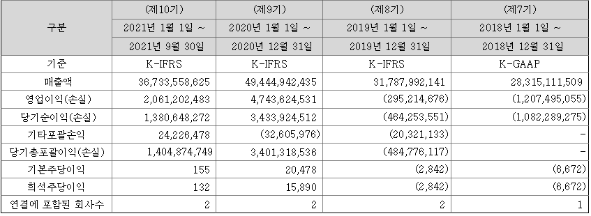 2020년 매출액은 494억원, 영업이익은 -47억 원, 당기순이익 -34억 원입니다.