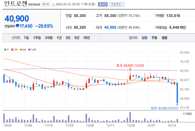 22년 1월 21일 하한가를 기록하였습니다. 당뇨병성 족부궤양 치료제(DFU-301) 한국 3상이 유효성 평가를 만족 못한 것으로 알려졌습니다. 안트로젠은 당뇨병성족부궤양 치료제 3상 결과 발표를 앞두고 있습니다. 회사 측은 홈페이지를 통해 "DFU-301 통계분석 결과 1차 유효성 평가를 만족하지 못했다"며 "회사는 현재 결과를 면밀히 분석하고 있으며 2월 중순 내로 주주분들에게 설명하는 기회를 갖겠다"라고 전했습니다.