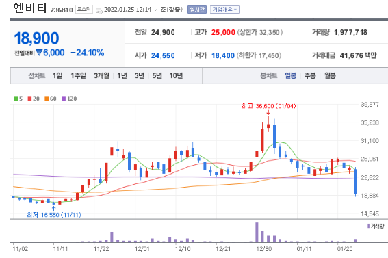 1월 25일 현재 주가는 18,900원으로 52주 최고가는 36,600원, 최저가는 16,200원입니다.